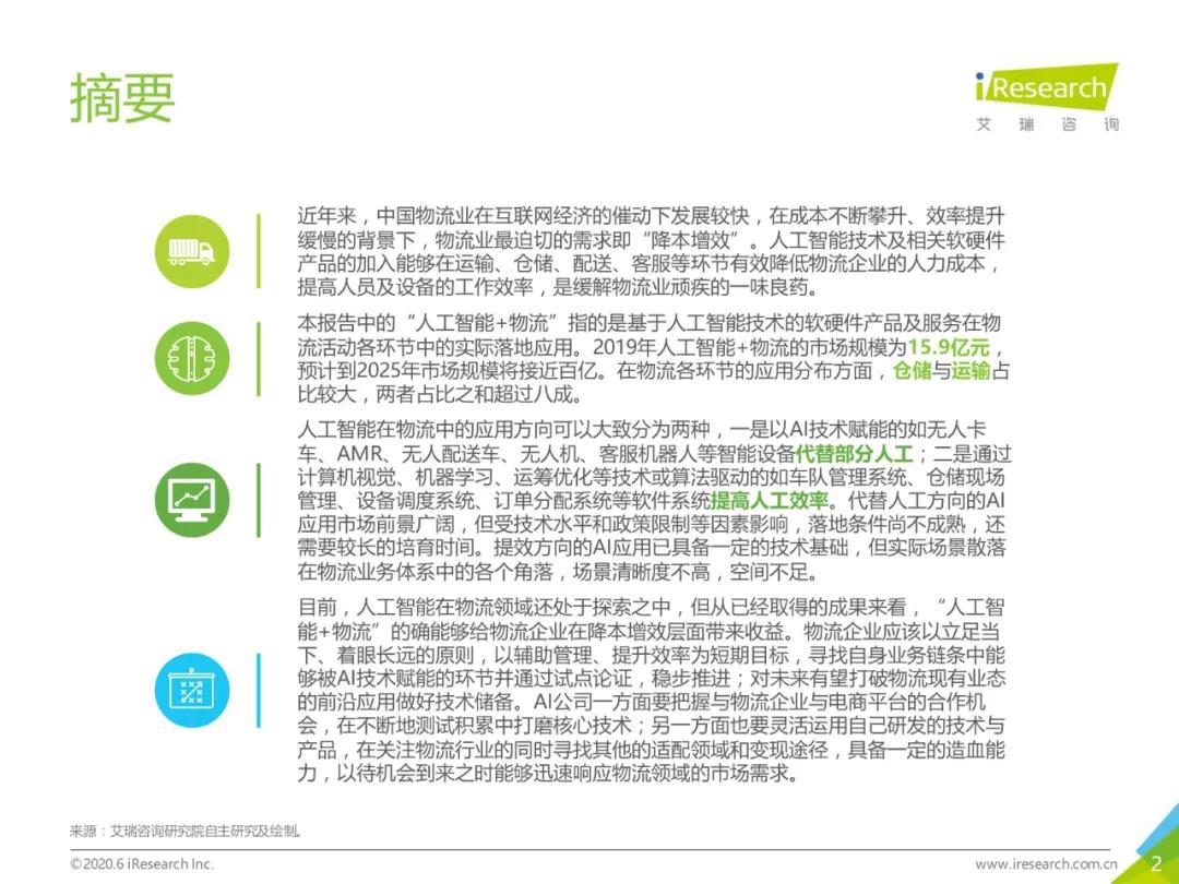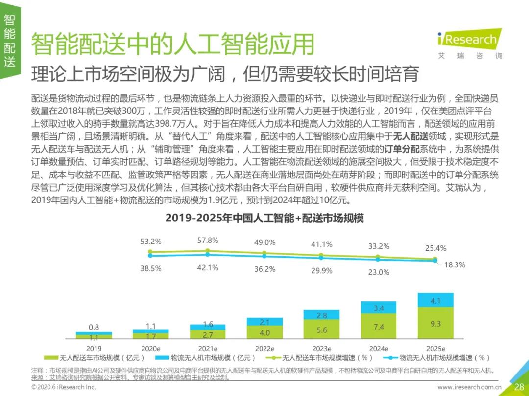 报告指出,2019年人工智能+物流的市场规模为15.9亿元,预计到2025年市场规模将接近百亿。